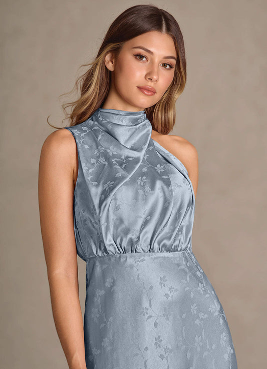 Dusty Blue A-Line Pleated Stretch Satin Dress