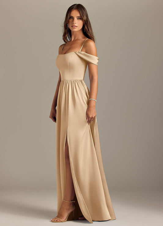A-Line Off-The-Shouler Pleated Stretch Satin Floor-Length Dress Champagne