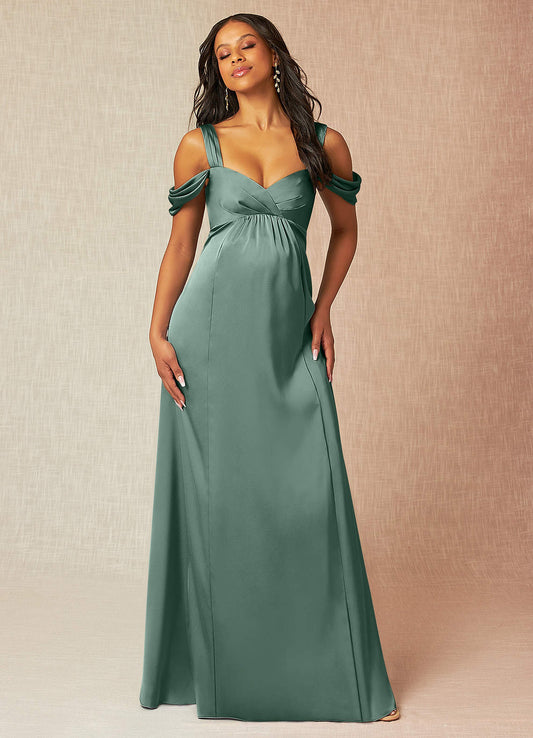 A-Line Pleated Metallic Satin Floor-Length Dress Matcha