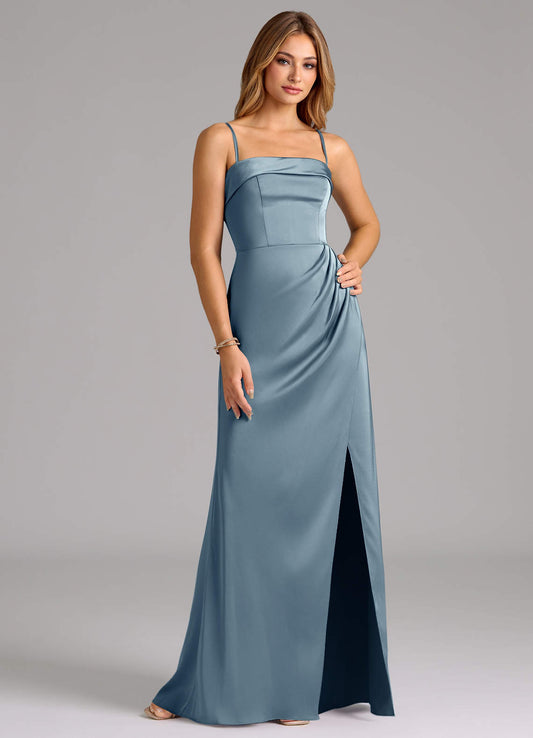 Dusty Blue A-Line Pleated Stretch Satin Dress