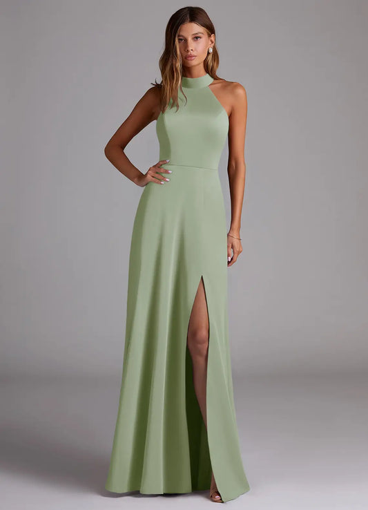Dusty Blue A-Line High Neck Stretch Satin Dress