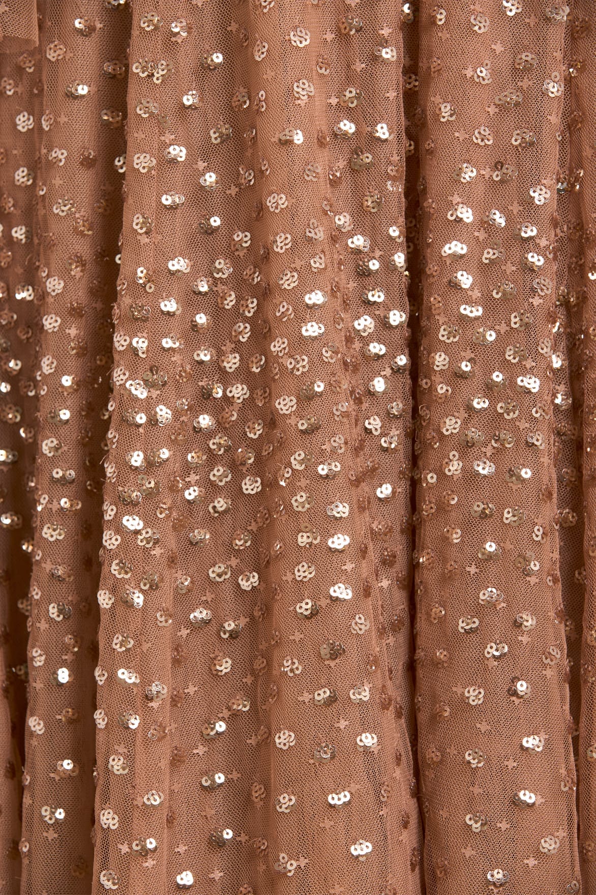 This gown features shimmering dot motifs that create a glittering effect, with sequins coated for a lustrous, high-shine finish. Designed as a sheer statement dress, it includes an integrated stretch bodysuit for comfort. Crafted with slim sleeves and a round neckline, adorned with signature Needle & Thread tulle frills, complete the look. The ultimate piece for an upcoming special occasion. tulle sheer dress decorated with tonal sequins.