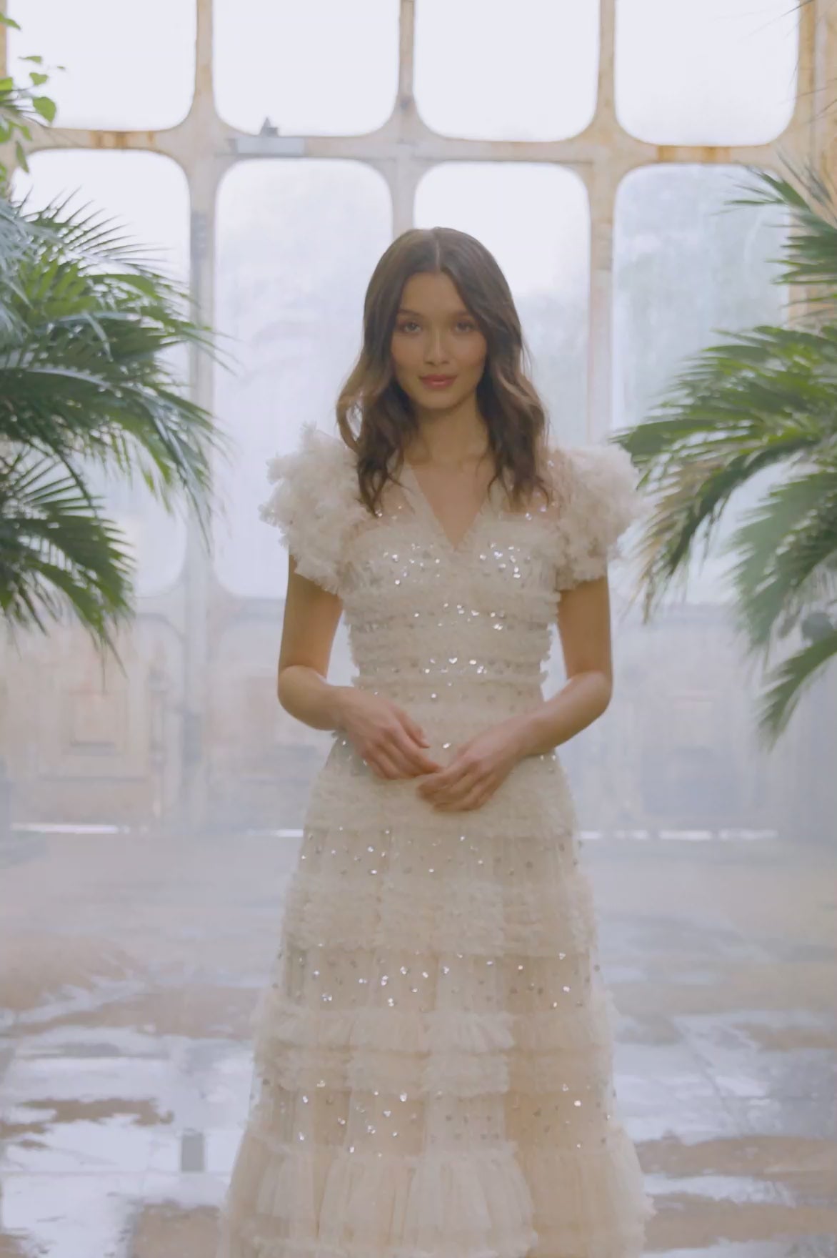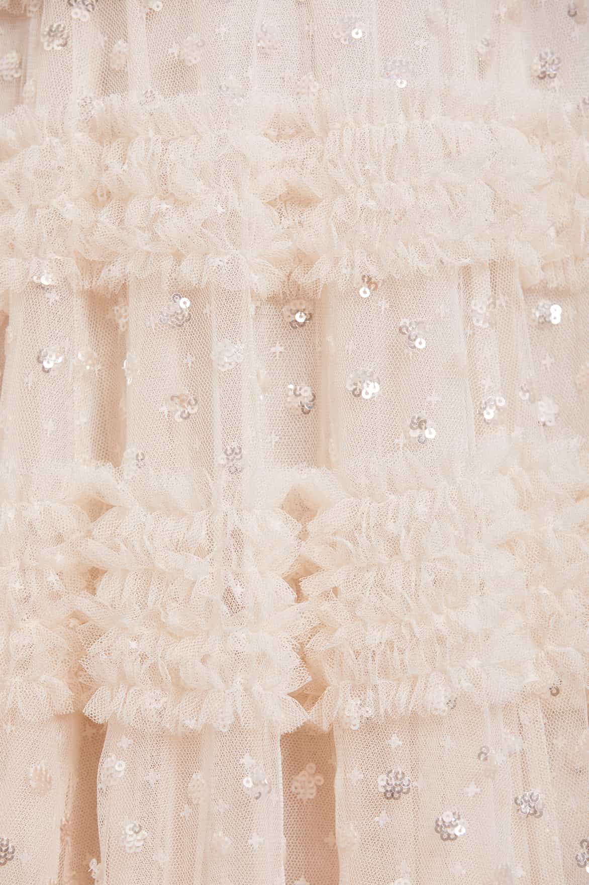 This gown features shimmering dot motifs that create a glittering effect, with sequins coated for a lustrous, high-shine finish. Designed as a sheer statement dress, it includes an integrated stretch bodysuit for comfort. Crafted with slim sleeves and a round neckline, adorned with signature Needle & Thread tulle frills, complete the look. The ultimate piece for an upcoming special occasion. tulle sheer dress decorated with tonal sequins.