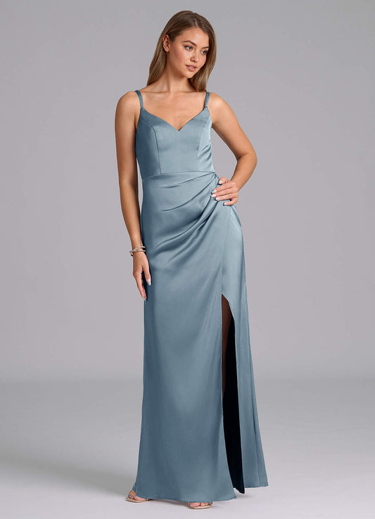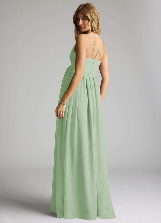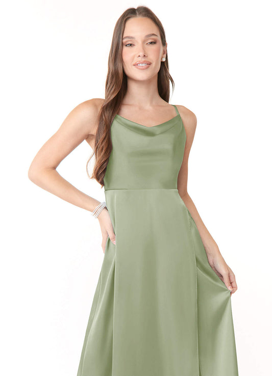 A-Line Pleated Metallic Satin Floor-Length Dress Matcha