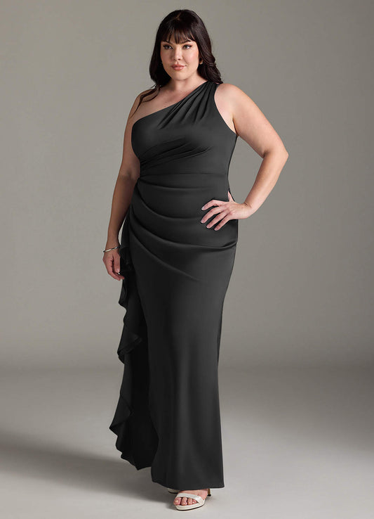 Burgundy Sheath One Shoulder Cascading Ruffles Stretch Satin Dress