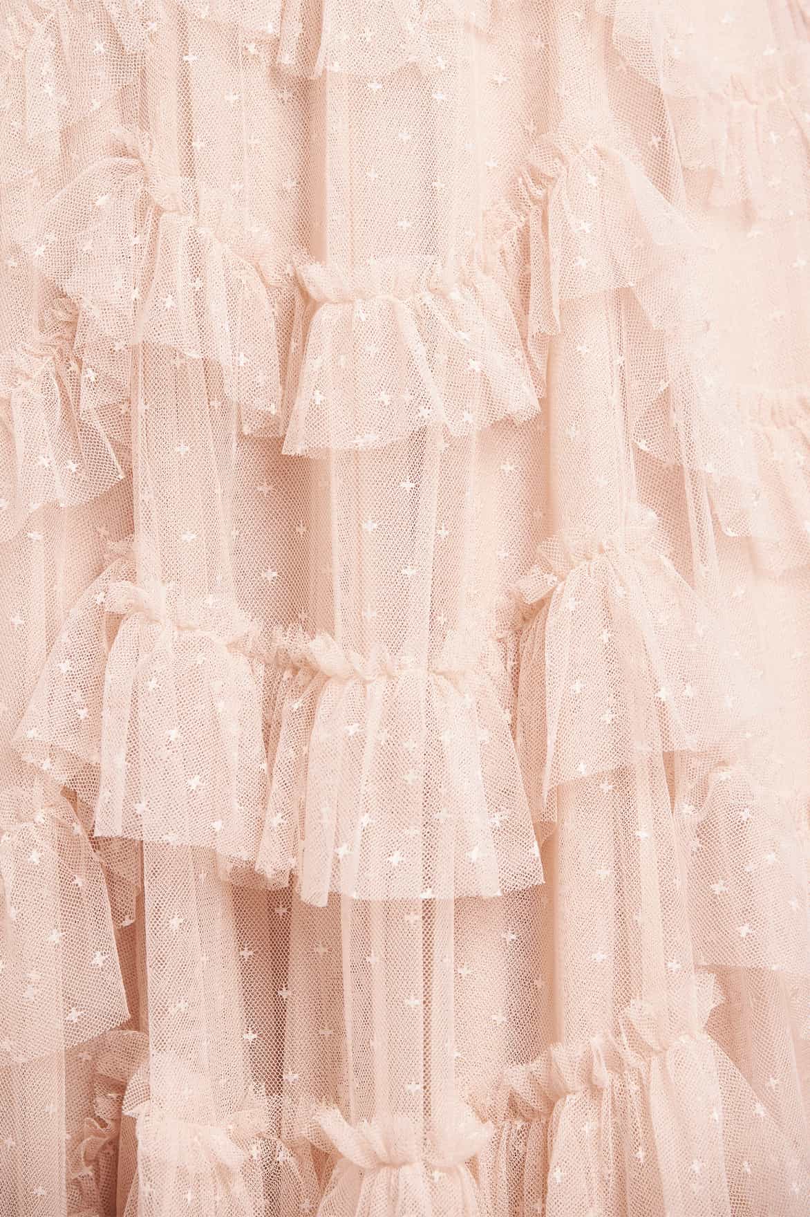 This gown features shimmering dot motifs that create a glittering effect, with sequins coated for a lustrous, high-shine finish. Designed as a sheer statement dress, it includes an integrated stretch bodysuit for comfort. Crafted with slim sleeves and a round neckline, adorned with signature Needle & Thread tulle frills, complete the look. The ultimate piece for an upcoming special occasion. tulle sheer dress decorated with tonal sequins.