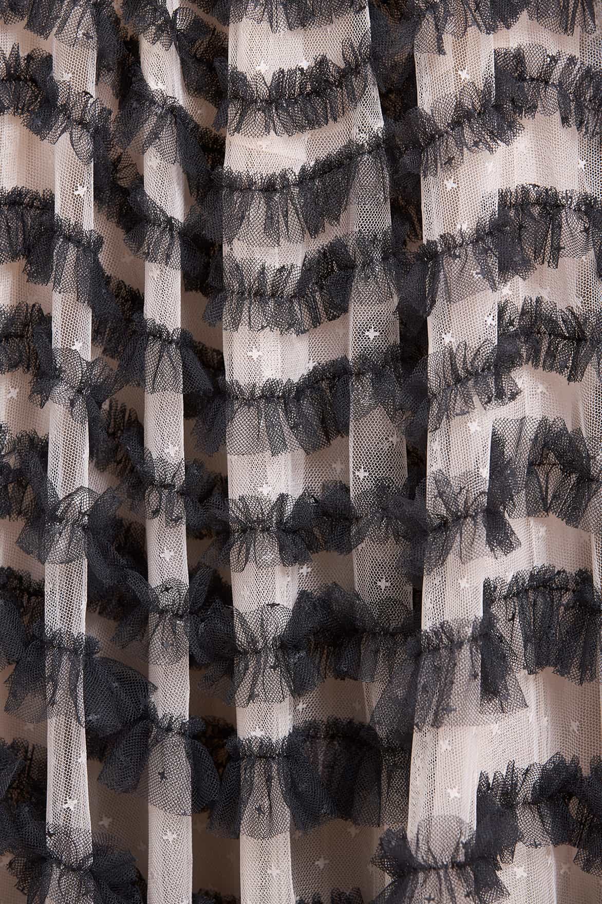 This gown features shimmering dot motifs that create a glittering effect, with sequins coated for a lustrous, high-shine finish. Designed as a sheer statement dress, it includes an integrated stretch bodysuit for comfort. Crafted with slim sleeves and a round neckline, adorned with signature Needle & Thread tulle frills, complete the look. The ultimate piece for an upcoming special occasion. tulle sheer dress decorated with tonal sequins.
