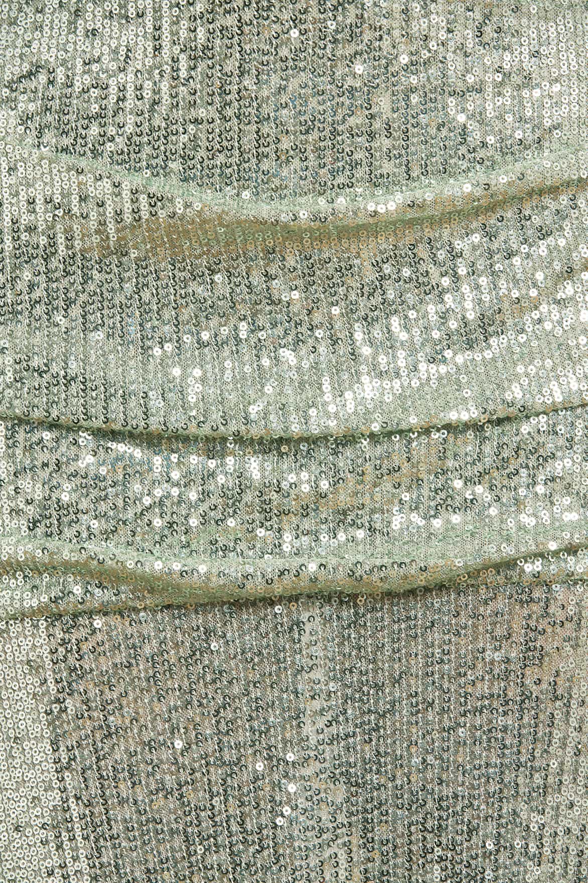 This gown features shimmering dot motifs that create a glittering effect, with sequins coated for a lustrous, high-shine finish. Designed as a sheer statement dress, it includes an integrated stretch bodysuit for comfort. Crafted with slim sleeves and a round neckline, adorned with signature Needle & Thread tulle frills, complete the look. The ultimate piece for an upcoming special occasion. tulle sheer dress decorated with tonal sequins.