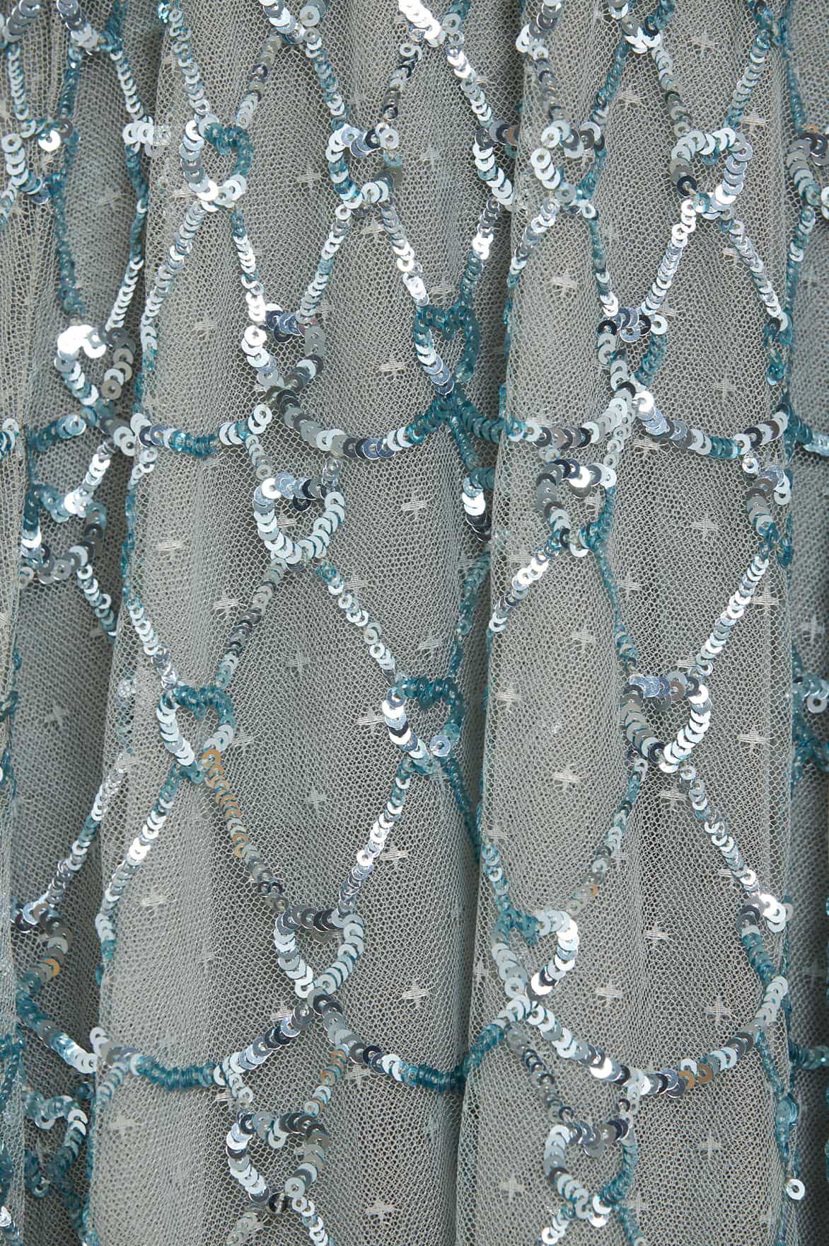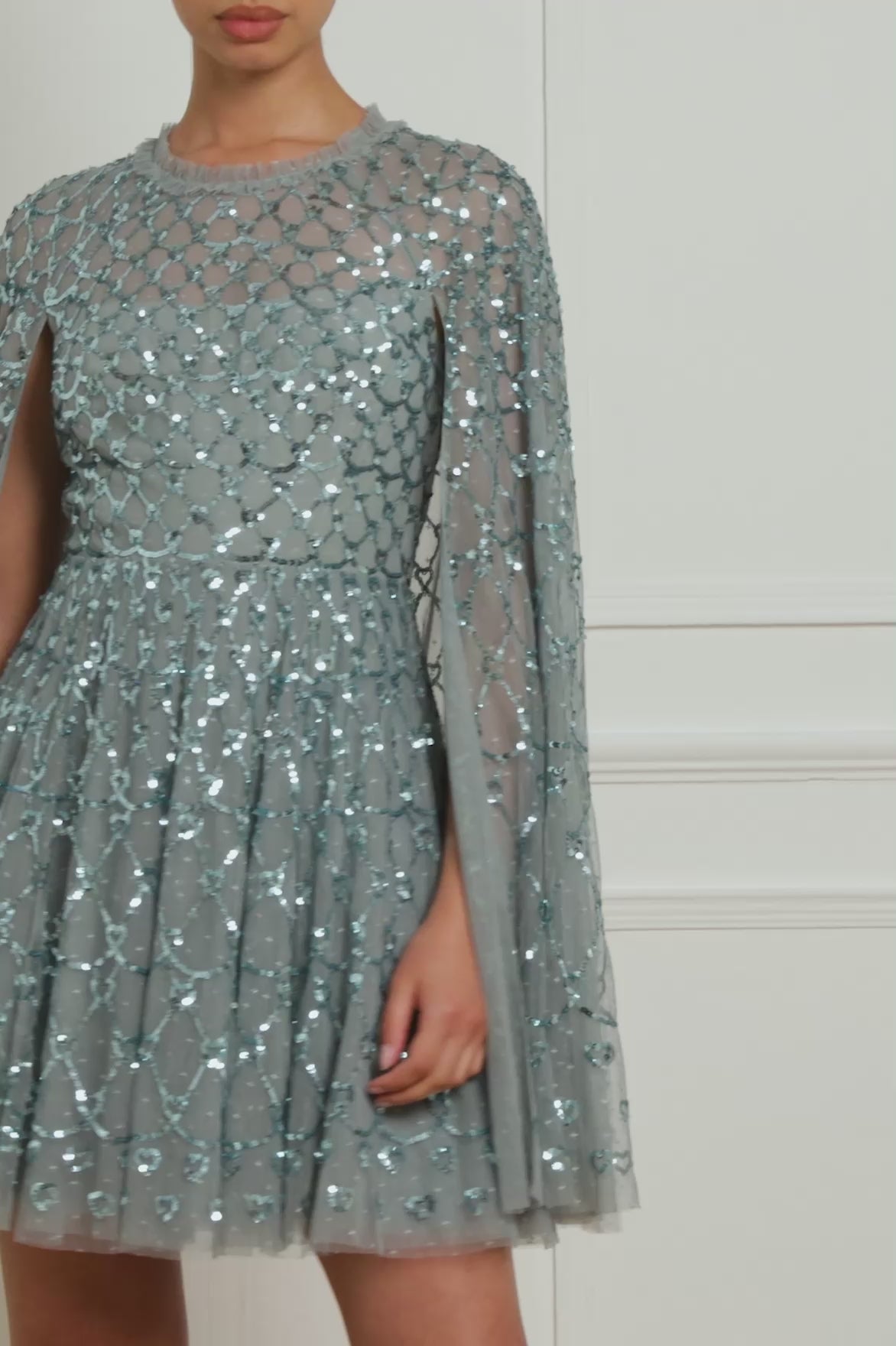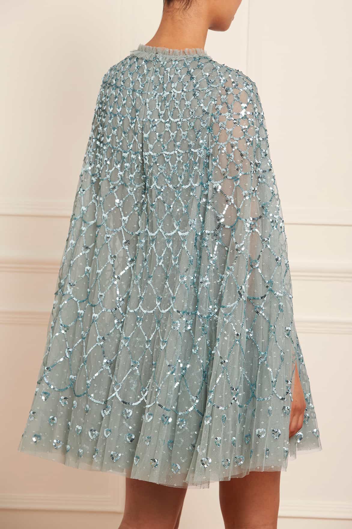 This gown features shimmering dot motifs that create a glittering effect, with sequins coated for a lustrous, high-shine finish. Designed as a sheer statement dress, it includes an integrated stretch bodysuit for comfort. Crafted with slim sleeves and a round neckline, adorned with signature Needle & Thread tulle frills, complete the look. The ultimate piece for an upcoming special occasion. tulle sheer dress decorated with tonal sequins.