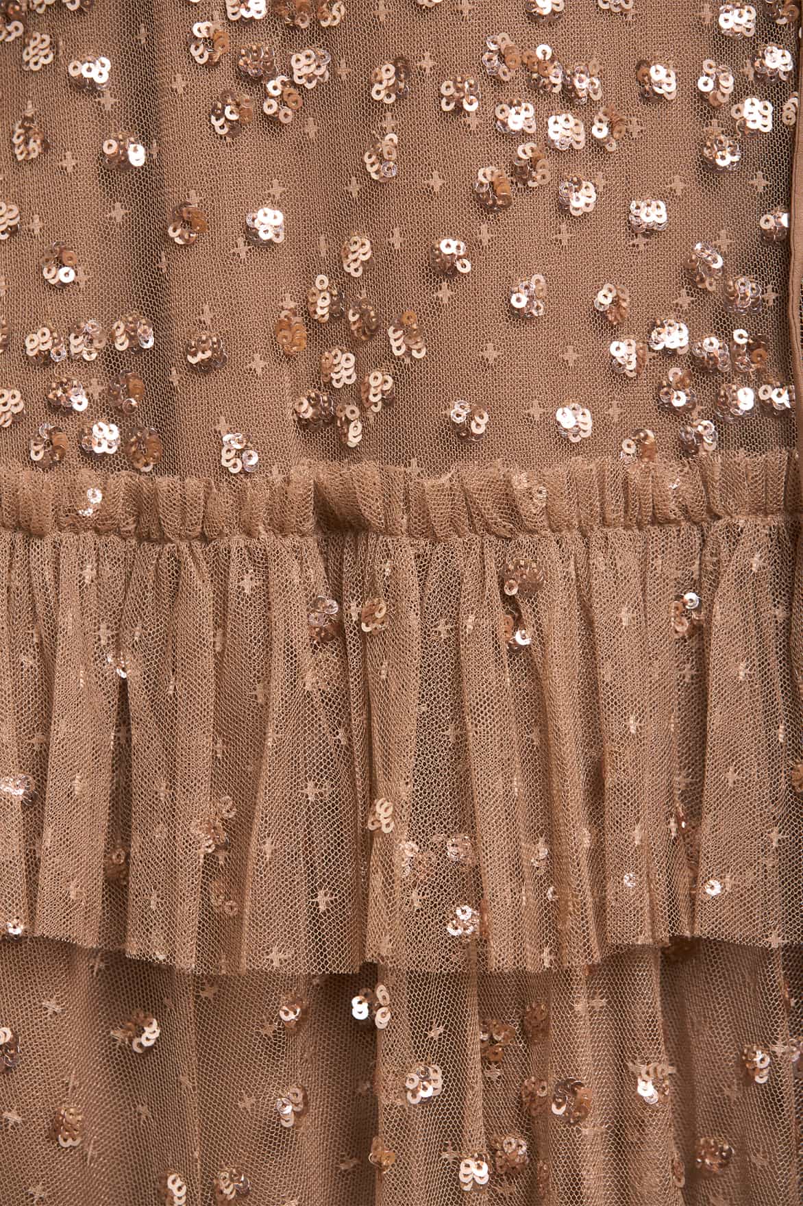 This gown features shimmering dot motifs that create a glittering effect, with sequins coated for a lustrous, high-shine finish. Designed as a sheer statement dress, it includes an integrated stretch bodysuit for comfort. Crafted with slim sleeves and a round neckline, adorned with signature Needle & Thread tulle frills, complete the look. The ultimate piece for an upcoming special occasion. tulle sheer dress decorated with tonal sequins.