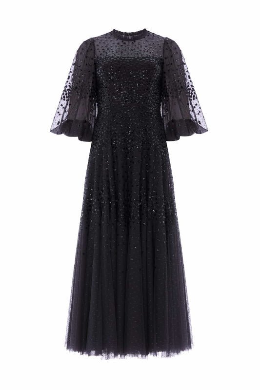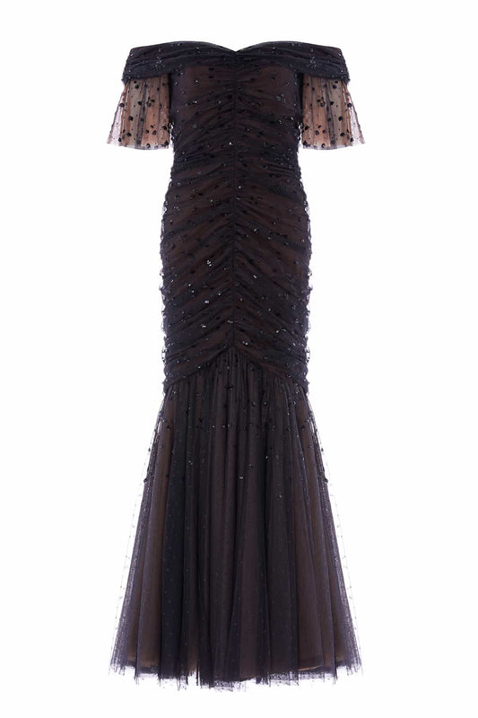 Dappled Sequin Draped Off-Shoulder Midaxi Dress