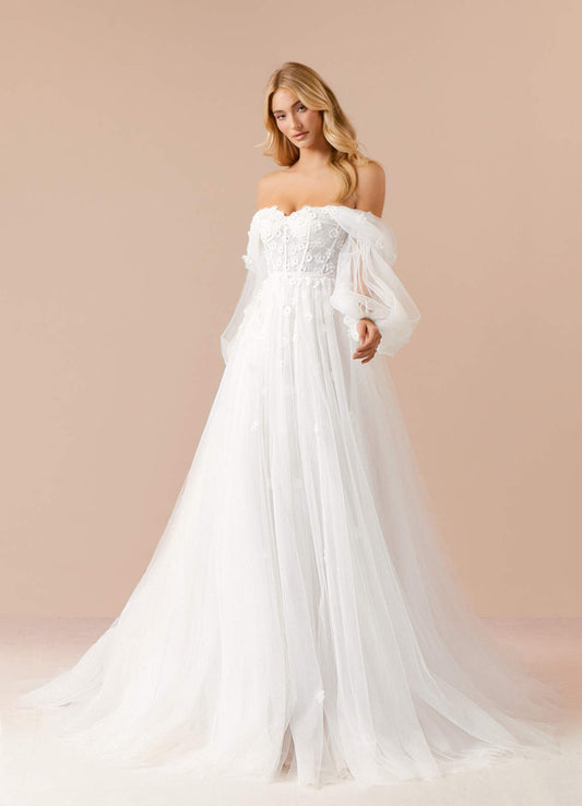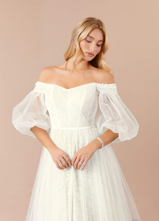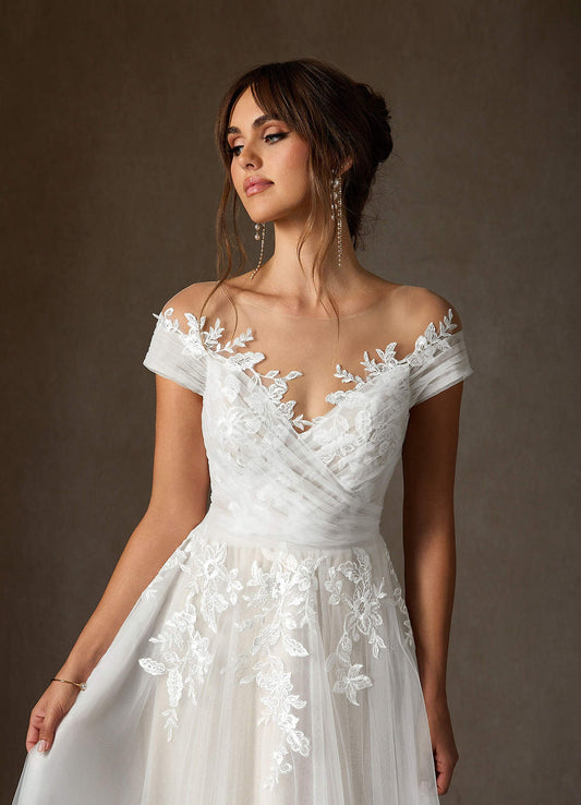 Diamond White A-Line Illusion Off-The-Shouler Lace Tulle Dress