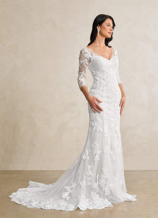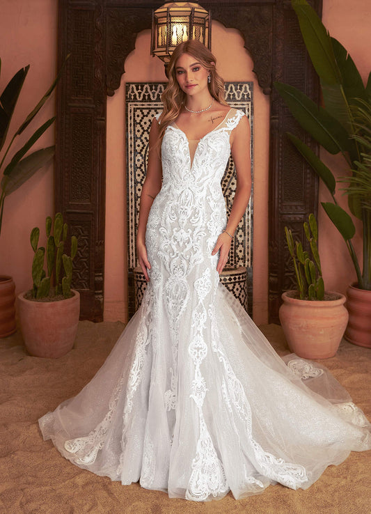 Diamond White Mermaid V-Neck Lace Tulle Dress