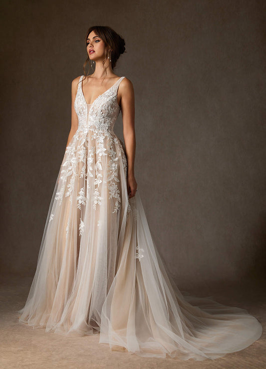 Diamond White A-Line V-Neck Sequins Tulle Dress