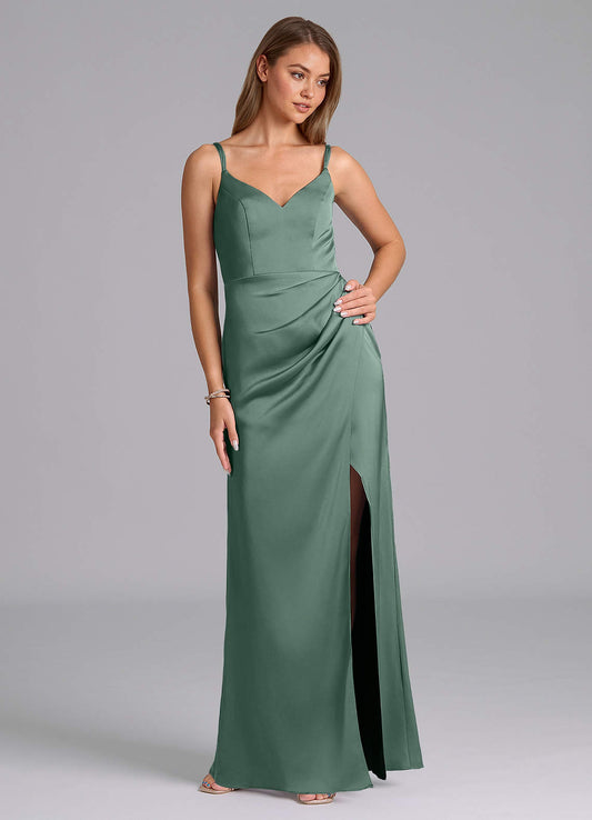 A-Line V-Neck Pleated Mesh Floor-Length Dress Matcha