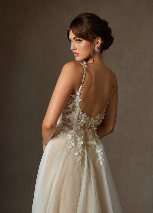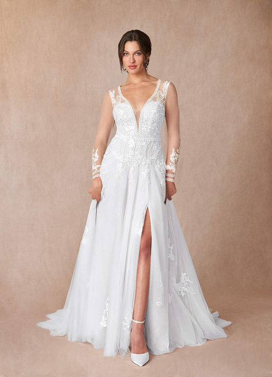 Diamond White A-Line V-Neck Lace Tulle Dress