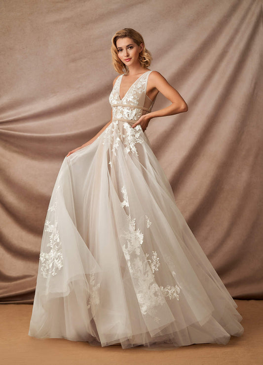 Diamond White A-Line V-Neck lace Tulle Dress