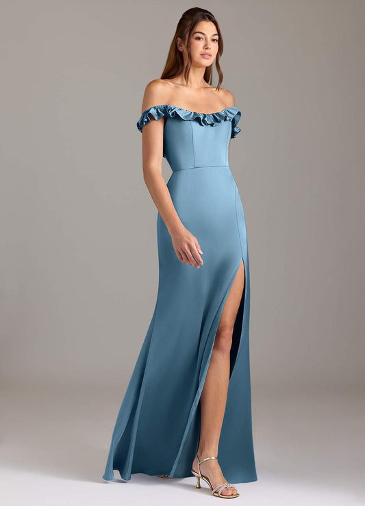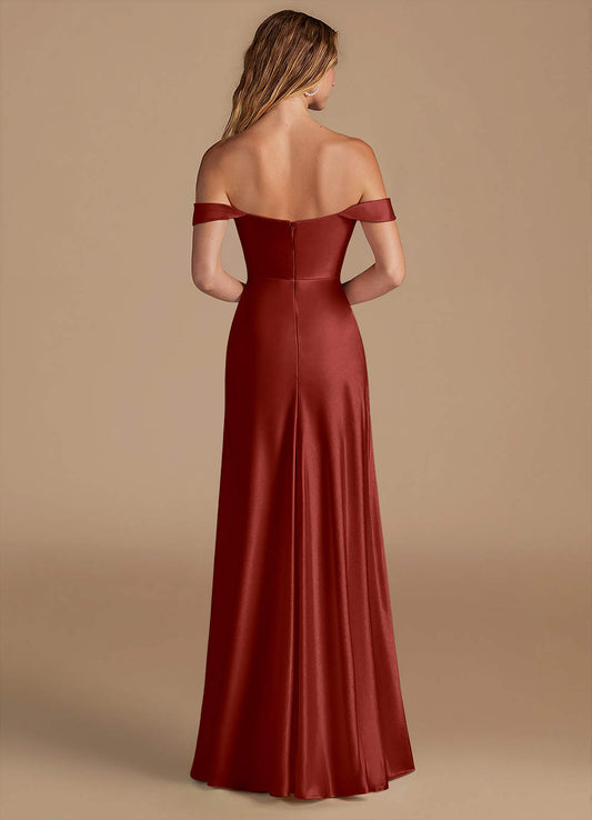 Champagne A-Line Off the Shoulder Stretch Satin Dress