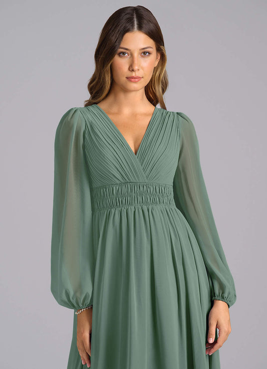Eucalyptus A-Line V-Neck Pleated Stretch Satin Dress