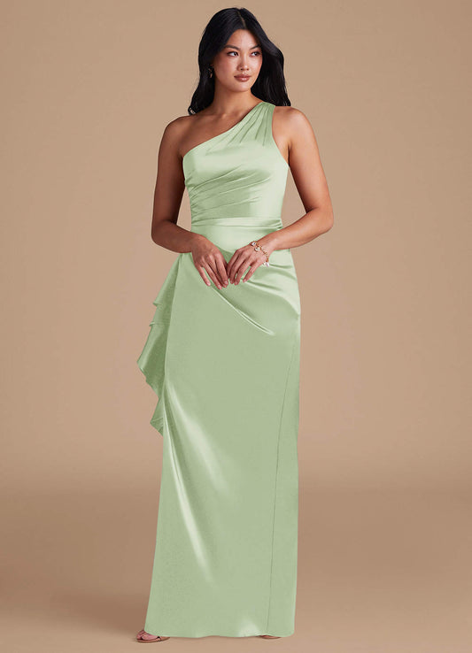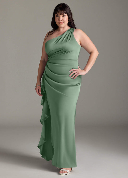 Dusty Sage Sheath One Shoulder Cascading Ruffles Stretch Satin Dress