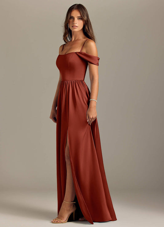 A-Line Off-The-Shouler Pleated Stretch Satin Floor-Length Dress Champagne